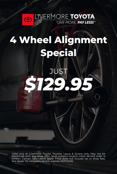 Special Offer: Get your vehicle's alignment for just $129.95 + tax at Livermore Toyota! Ensure smooth driving and extend tire life. Limited time deal – visit us now!